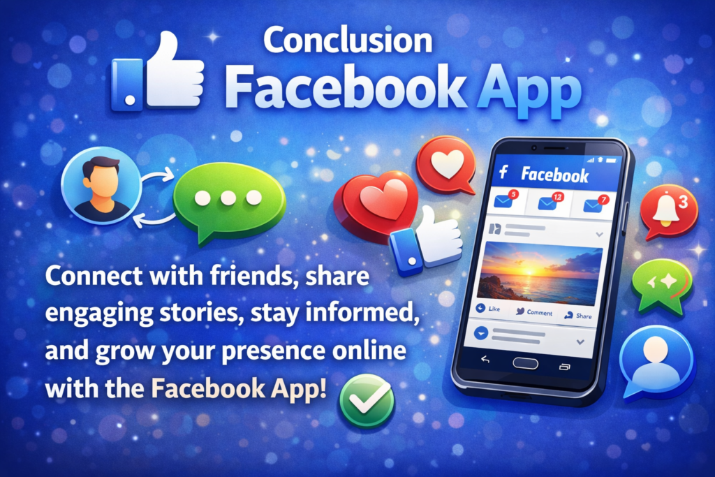 Throughout this guide, we explored the key features of the Facebook App, including the News Feed, Stories, Messenger, Groups, and Marketplace. These tools make communication easier, entertainment more accessible, and online business more effective. The app also provides valuable opportunities for marketing, branding, and customer engagement, helping businesses grow in the competitive digital world. Developed by Meta Platforms, the platform continues to introduce new updates and improvements to enhance user experience.